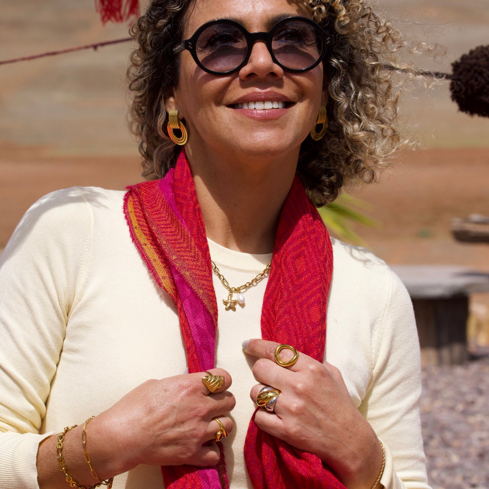 Pacífico tiene ese look redondeado y chunky que completa cualquier outfit con un toque bold sin perder elegancia. Su volumen y textura pulida brillan de una manera cálida y sofisticada, justo lo que quieres cuando buscas algo con presencia pero súper combinable.