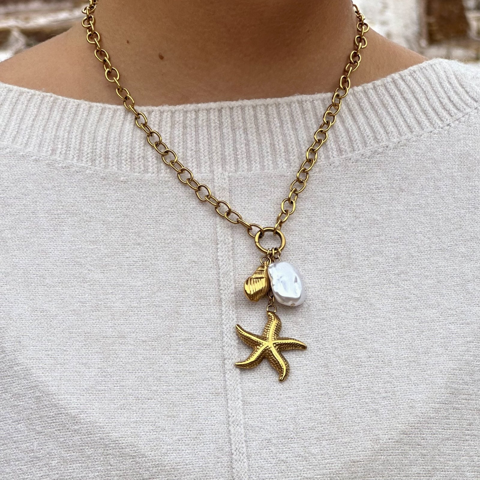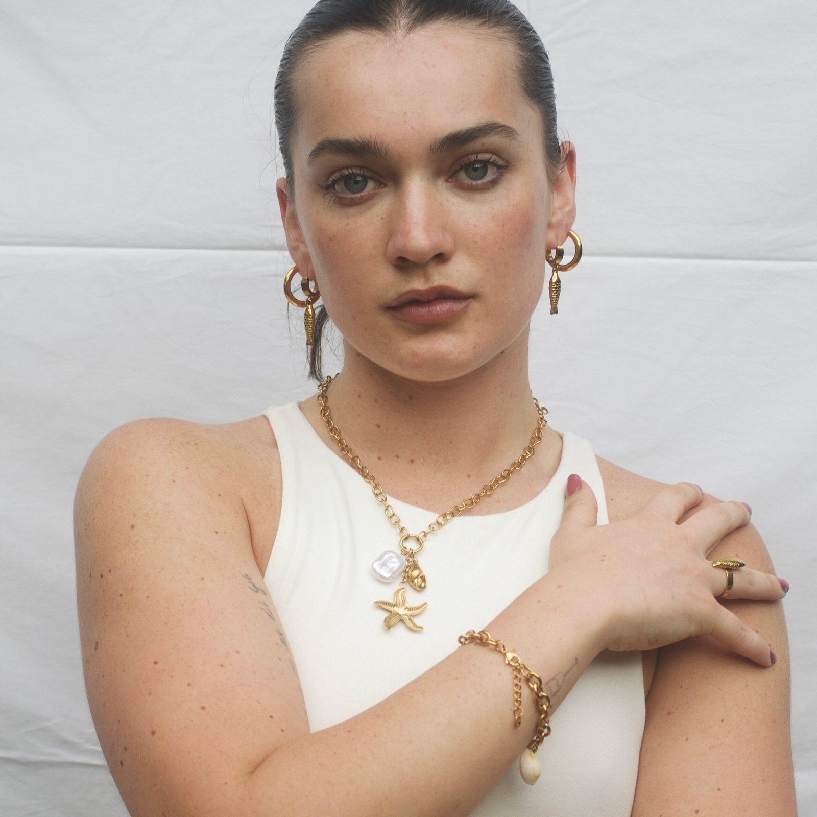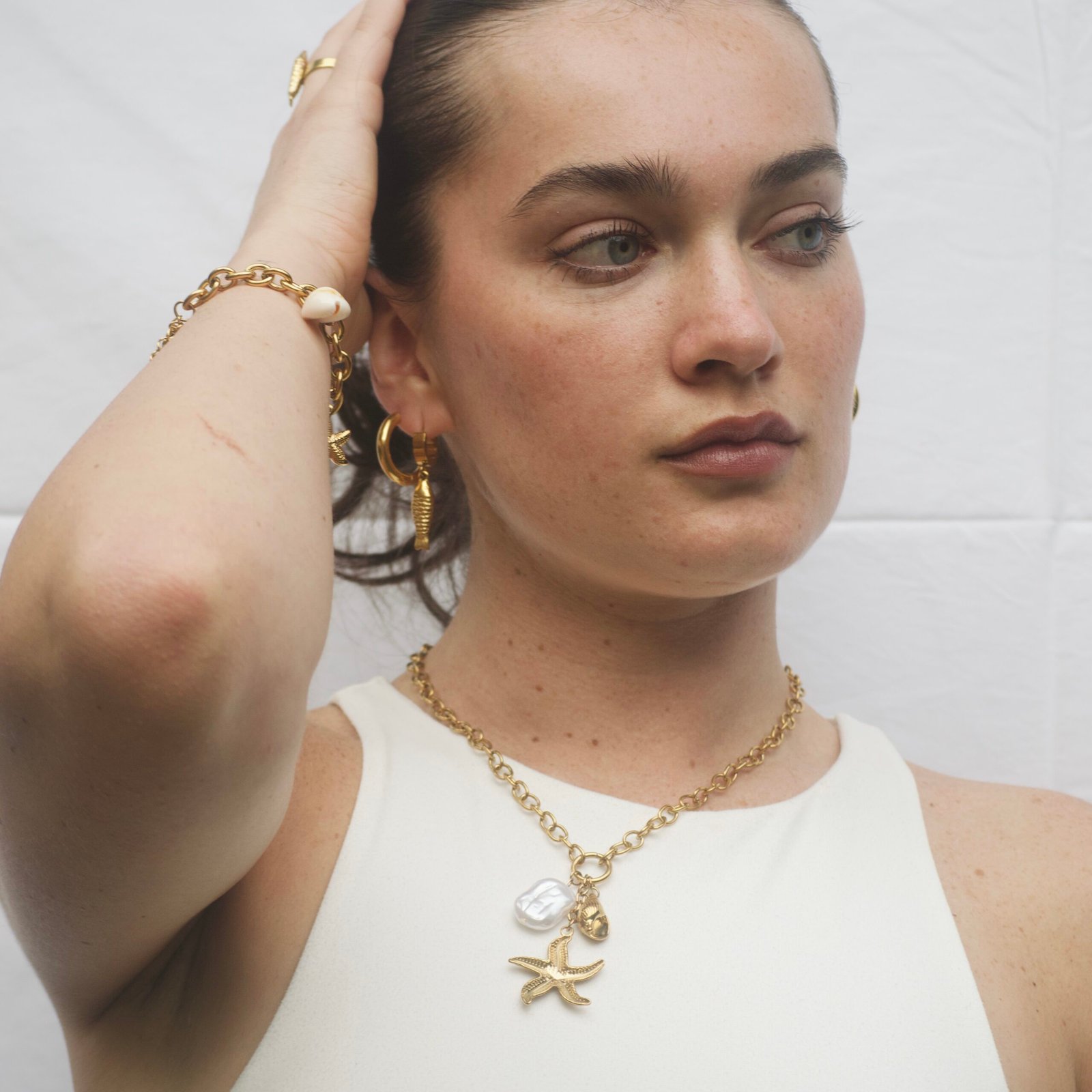 La combinación de la cadena de eslabones con charms marinos crea una caída ligera y equilibrada, pensada para usarla sola o en layering.