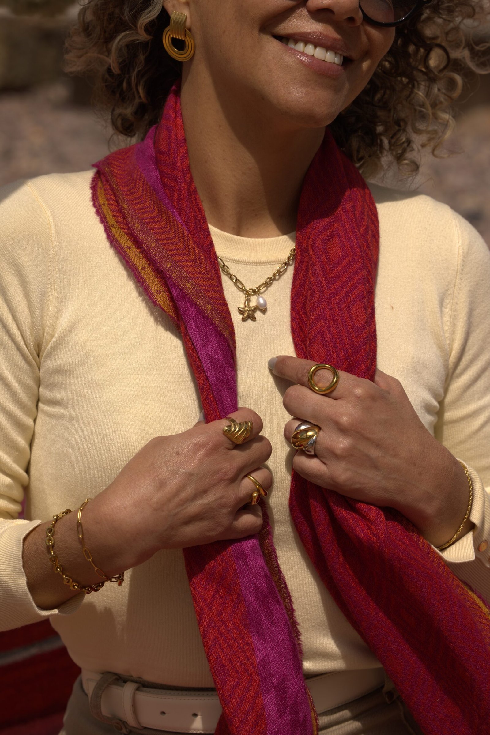 Es una pieza luminosa y fresca, perfecta para elevar cualquier look con un toque veraniego, femenino y con vibra de playa.