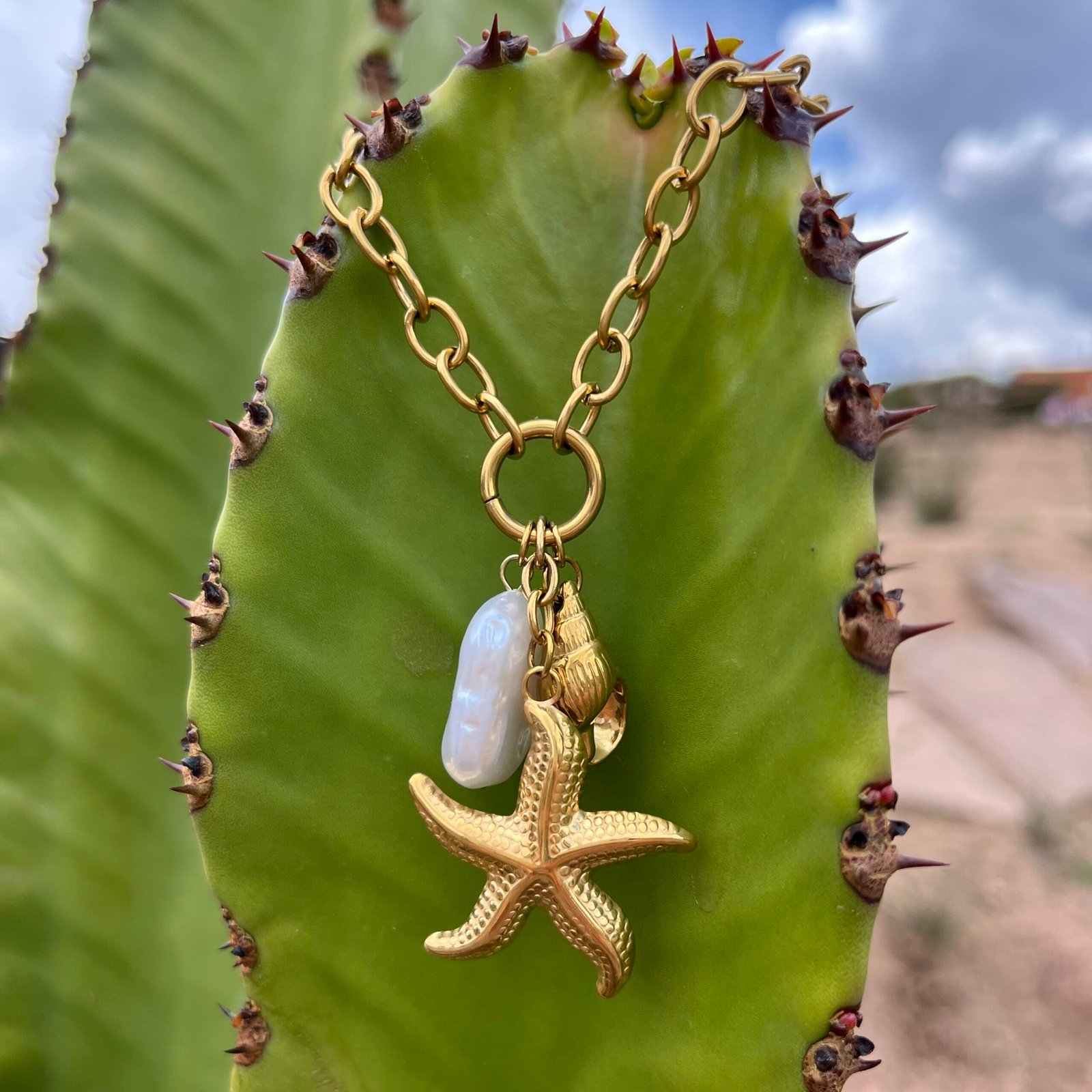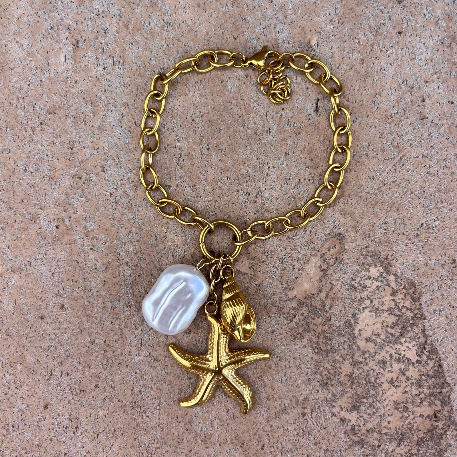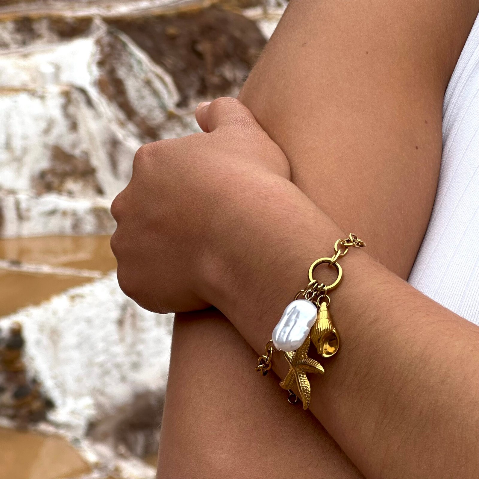 Su diseño combina una cadena de eslabones moderna con tres charms marinos —una estrella de mar, una concha y una perla irregular— creando una pieza llena de vida, movimiento y carácter. Es perfecta para quienes aman accesorios con vibra playera, detalles especiales y un toque sofisticado que transforma cualquier look.
